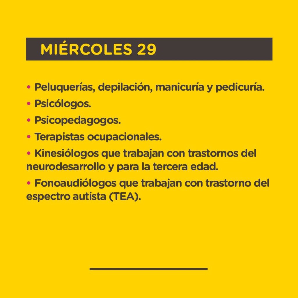 Además, también está permitida la habilitación de la depilación, la manicuría y la pedicuría. Y en cuanto a los tratamientos médicos, en la lista de actividades permitidas se suman las terapistas ocupacionales, kinesiólogos, que trabajan con trastornos del neurodesarrollo y para tercera edad y fonoaudiólogos, que trabajan con trastorno del espectro autista (TEA).